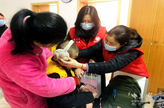活動現(xiàn)場,他們與受助學(xué)生一一拉鉤結(jié)對,將自己準(zhǔn)備好的御寒手套、護(hù)耳罩等贈送給接受幫扶的學(xué)生,并將自己的電話號碼留給他們?!跋M阍谛碌囊荒曛锌鞓穼W(xué)習(xí)、健康成長,祝你新年愉快,記得保持聯(lián)系哦!”志愿者們的關(guān)愛和句句祝福,在受助學(xué)生心中播下了友誼與愛的種子。