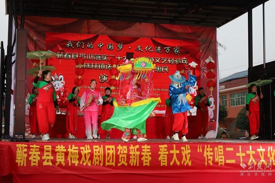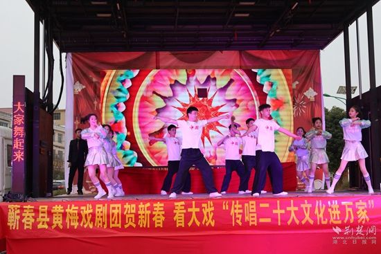 荊楚網(wǎng)(湖北日報網(wǎng))訊(通訊員凌敏、程楚輝)2月2日,由蘄春縣委宣傳部、縣文化和旅游局、株林鎮(zhèn)人民政府聯(lián)合主辦的“我們的中國夢文化進萬家暨蘄春縣貫徹落實二十大精神+送戲下鄉(xiāng)”惠民文化演出走進當?shù)劓?zhèn)村一線,用黃梅戲表演唱等形式,把黨的二十大精神送到老百姓家門口,贏得群眾一片叫好聲。