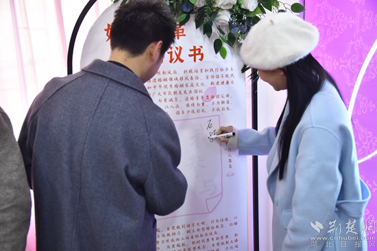 荊楚網(wǎng)(湖北日?qǐng)?bào)網(wǎng))訊(通訊員 杜巧云、石姣、陳俊)“我承諾:抵制高價(jià)彩禮,為愛減負(fù),拒絕低俗婚鬧,為愛守禮,主張婚事簡(jiǎn)辦,為愛啟航,傳承優(yōu)秀文化,為愛踐行……”2月14日上午,大冶市婚姻登記處為當(dāng)日上午登記領(lǐng)證的50對(duì)新人舉行“為愛減負(fù),我承諾、我踐行”集體頒證活動(dòng),新人們?cè)谶@個(gè)特殊的日子集體宣誓并在《婚俗改革倡議書》上簽字承諾。