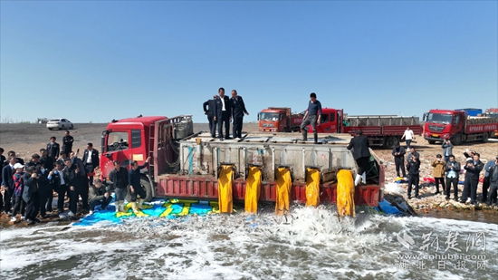 活動現(xiàn)場,一輛輛滿載魚苗的大型貨車有序駛向江邊,工作人員爬上車,用撈魚網舀起魚苗認真察看,隨后打開裝魚苗的容器,不同種類的魚苗沿著放置的斜面傾瀉,伴著晶瑩的水花,四散游向更遠處。