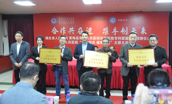 荊楚網(wǎng)(湖北日報網(wǎng))訊(通訊員劉學(xué)平)4月23日,湖北省人民醫(yī)院和黃梅縣第二人民醫(yī)院(孔壟鎮(zhèn)衛(wèi)生院)協(xié)作醫(yī)院??坡?lián)盟簽約授牌暨省人民醫(yī)院“百年院慶 健康惠民”大型義診活動在黃梅縣孔壟鎮(zhèn)舉行。