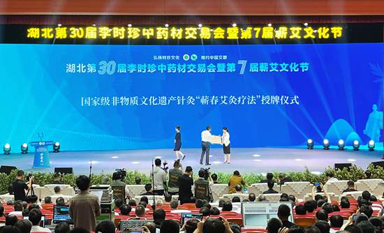 授予國家級非物質(zhì)文化遺產(chǎn)針灸“蘄春艾灸療法”牌匾。阮瓊 攝