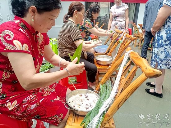 “先卷起粽葉,再填滿米,加蜜棗,再封口系繩,力道要適中?!痹诎兆訁^(qū)域,村民張嫂子作為巾幗志愿者非常耐心地教孩子包粽子。孩子們拿著粽葉幫忙放糯米,學得有模有樣。半個小時后,粽葉、糯米、粽繩等材料變成一個個棱角分明的棕子。