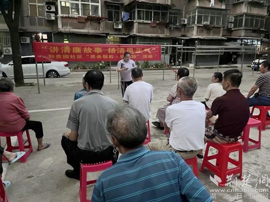 傍晚時分,身處湖濱花園小區(qū)的“和悠然 慢生活”休閑廣場,第二黨支部書記呂培根分享了《留得清氣滿乾坤》廉潔故事匯中的周恩來廉潔自律的故事。他勸誡領(lǐng)導(dǎo)干部們,要想成功度過思想、政治、社會、親屬和生活的五道關(guān)口,就必須堅守共產(chǎn)黨員的政治操守和優(yōu)良作風(fēng)。