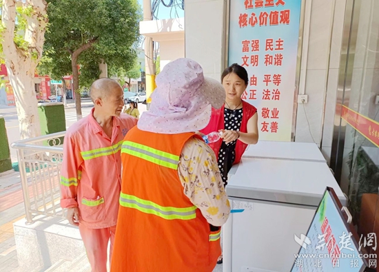 “長(zhǎng)期在室外高溫天氣下工作,每天都有揮汗如雨的感覺,渴了累了都能來喝杯水、歇歇腳真的很暖心,謝謝你們的關(guān)心和心意”,環(huán)衛(wèi)工人李師傅說。