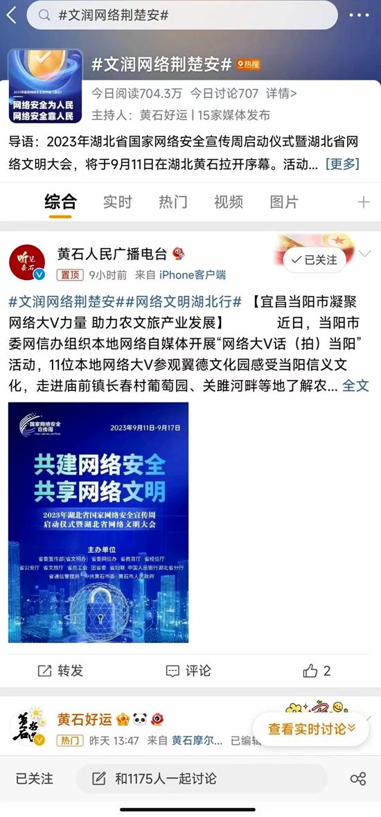 荊楚網(wǎng)(湖北日?qǐng)?bào)網(wǎng))訊(記者 呂鑒蕾 通訊員 黃旺宣)2023年湖北省國(guó)家網(wǎng)絡(luò)安全宣傳周啟動(dòng)儀式暨湖北省網(wǎng)絡(luò)文明大會(huì)開幕在即。連日來,圍繞“文潤(rùn)網(wǎng)絡(luò)荊楚安”“網(wǎng)絡(luò)文明湖北行”等話題,社交平臺(tái)上開啟了“湖北接力”。