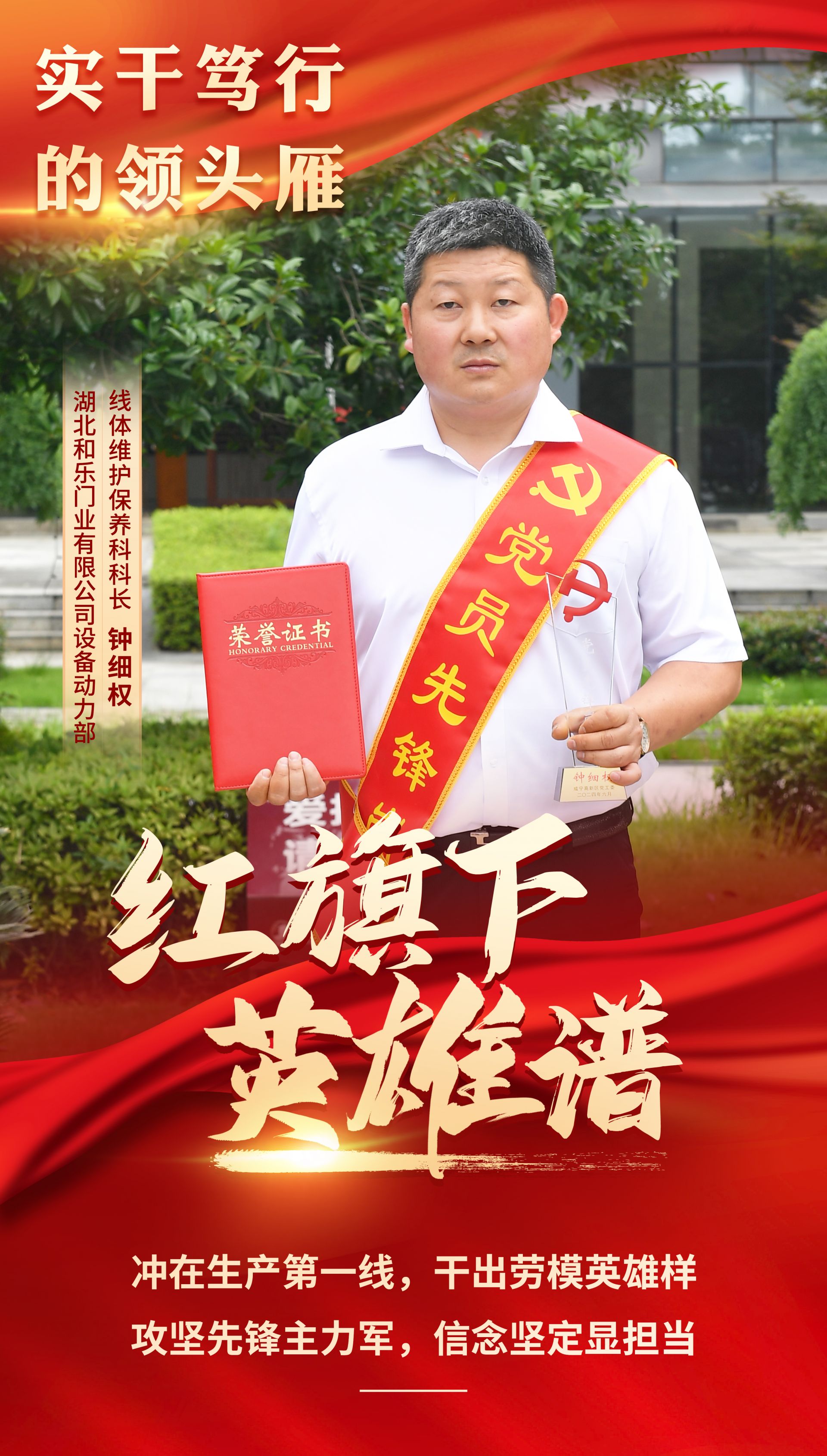 為進一步發(fā)揮黨支部戰(zhàn)斗堡壘和黨員先鋒模范作用,咸寧高新區(qū)黨工委研究決定,授予鐘細權等10名同志“黨員先鋒崗”榮譽稱號。