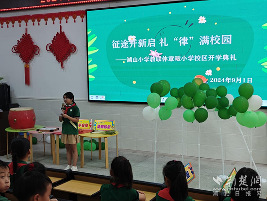 湖山小學教聯(lián)體章畈小學校區(qū),師生們齊聚學校報告廳,舉行“征途開新啟,禮“律”滿校園”為主題的開學典禮。