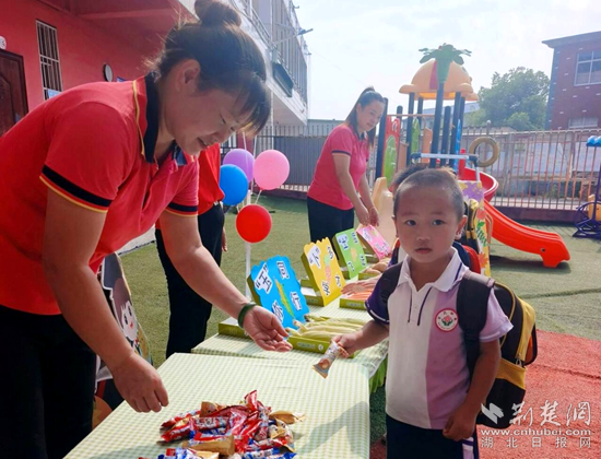 大王百花八祥幼兒園里,園長媽媽和老師們在門口熱情地迎接每一位小朋友的到來,為孩子們送上新學期的第一份祝福。