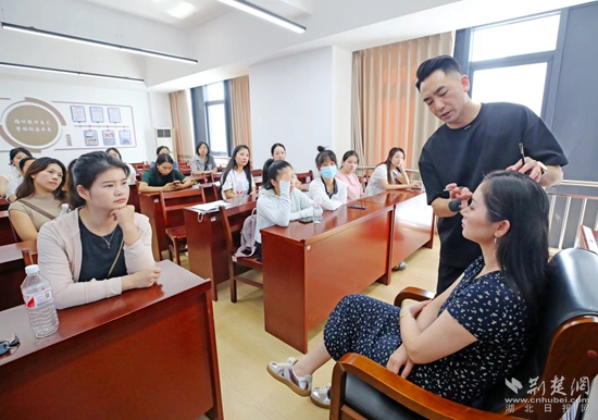 培訓室內(nèi),30名通過人社“一湖三鏈”數(shù)據(jù)湖+就業(yè)服務站鐵腳板匹配的女性居民,正在接受來自盛美化妝美甲培訓技能學校的就業(yè)指導師周艷君的精準培訓。