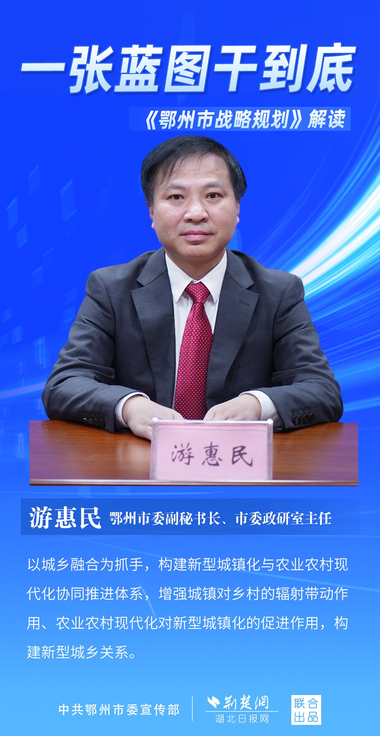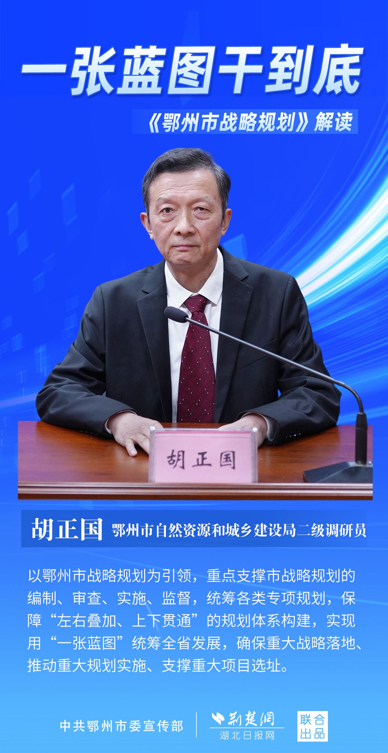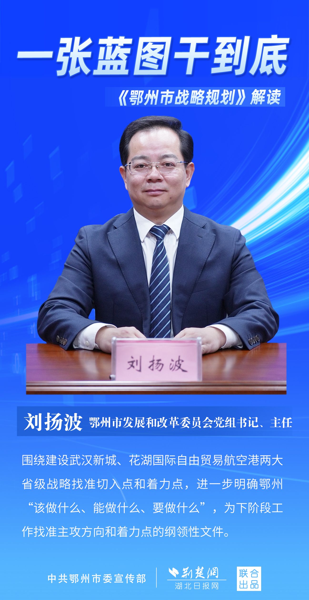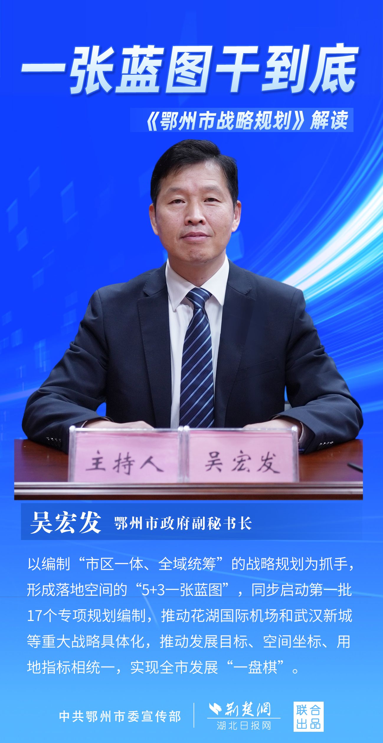 荊楚網(wǎng)(湖北日?qǐng)?bào)網(wǎng))訊(記者 劉璐、金康 通訊員 胡彥)11月7日上午,鄂州市召開(kāi)新聞發(fā)布會(huì),宣布《鄂州市戰(zhàn)略規(guī)劃》即將印發(fā)實(shí)施。市委副秘書長(zhǎng)、市委政研室主任游惠民透露,從機(jī)制優(yōu)化、指標(biāo)考核、項(xiàng)目實(shí)施等方面確保規(guī)劃制度有依據(jù)、成效可考核、實(shí)施有抓手。具體如何落實(shí)落地?讓我們用一組海報(bào)解讀《鄂州市戰(zhàn)略規(guī)劃》。