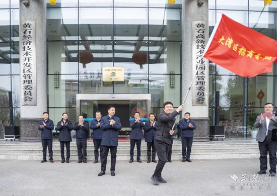 “期待你們凱旋而歸,出征!”授旗儀式上,黃石經(jīng)濟(jì)技術(shù)開發(fā)區(qū)黨工委書記、管委會主任、鐵山區(qū)委書記萬鼎為大灣區(qū)招商分局、三角招商分局、武漢招商分局、鐵山街道招商專班授旗,4名招商專班負(fù)責(zé)人鄭重接過旗幟。