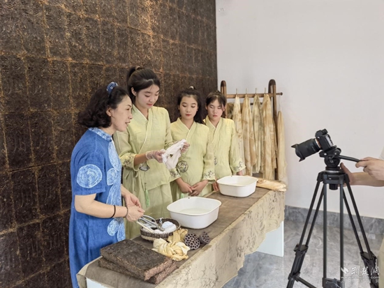 趙愛(ài)新(左一)帶領(lǐng)學(xué)生在羊樓洞古鎮(zhèn)現(xiàn)場(chǎng)制作茶染作品。通訊員 供圖