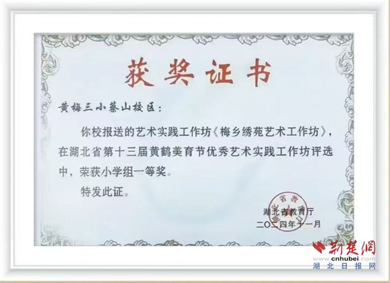 “讓孩子們從小學(xué)習(xí)挑花技藝,不能讓傳統(tǒng)技藝失傳,同時(shí)通過挑花活動培養(yǎng)孩子們靜下心來專注做事的良好品質(zhì)?!蓖趺粽f。2024年秋,學(xué)?!懊粪l(xiāng)繡苑”挑花工作坊帶著師生挑繡的作品參加湖北省第十三屆黃鶴美育節(jié),榮獲藝術(shù)實(shí)踐工作坊一等獎(jiǎng)。