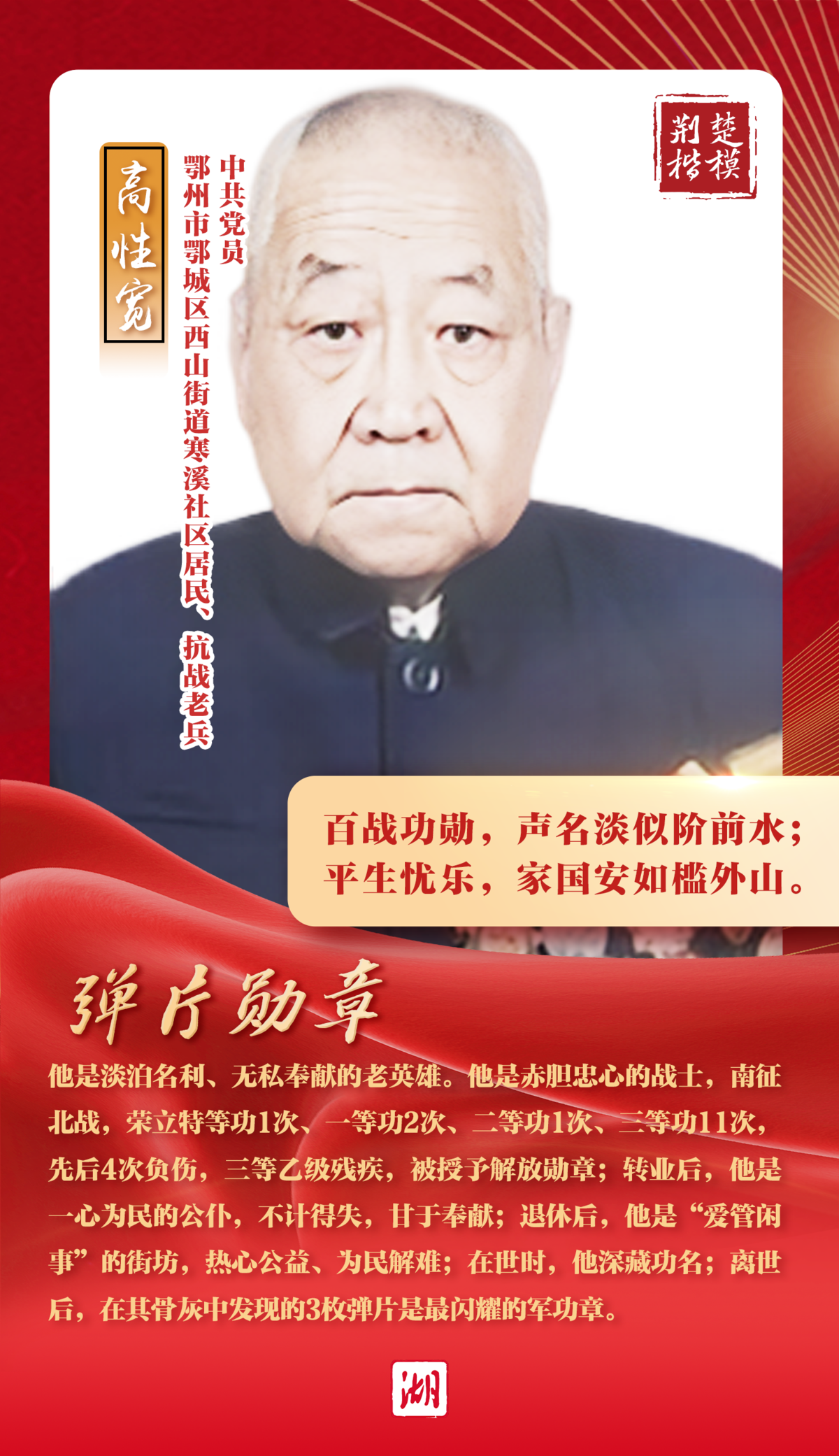 高性寬,男,漢族,1931年4月出生,河南省博愛縣人,2024年4月28日,在湖北省鄂州市鄂城區(qū)去世。省楹聯(lián)學會這樣講述他:百戰(zhàn)功勛,聲名淡似階前水;平生憂樂,家國安如檻外山。橫批:彈片勛章。