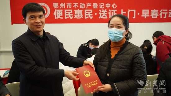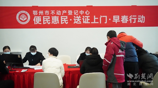 荊楚網(wǎng)(湖北日報網(wǎng))訊(通訊員 周婷)3月22日上午,鄂州市不動產(chǎn)登記中心開展“便民惠民送證上門”活動,將辦證服務(wù)窗口延伸到楚天都市鑫園售樓部,現(xiàn)場接受購房群眾申請,現(xiàn)場受理,現(xiàn)場發(fā)證。