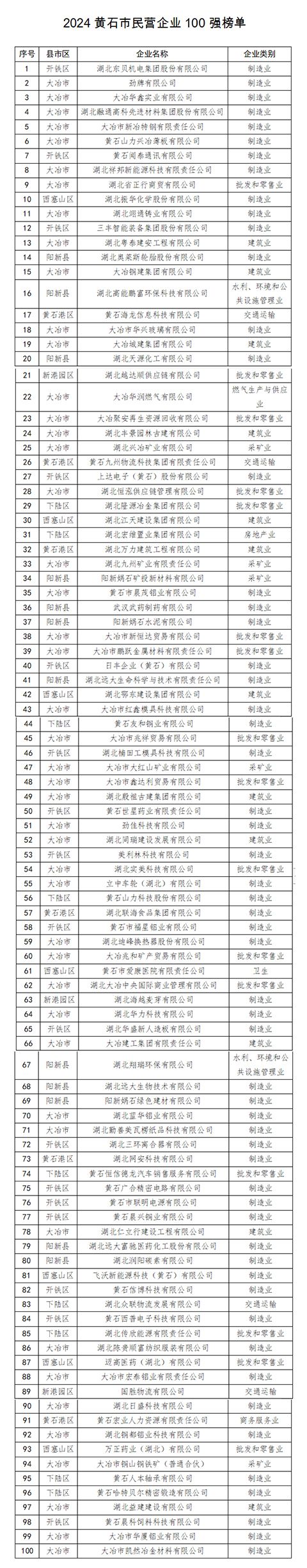 荊楚網(wǎng)(湖北日報網(wǎng))訊(記者 阮瓊 通訊員 李玉)“民營經(jīng)濟(jì)增加值占GDP比重達(dá)60.5%,已成為市域經(jīng)濟(jì)的重要支撐……”7月9日,在黃石市促進(jìn)民營經(jīng)濟(jì)健康發(fā)展新聞發(fā)布會上,黃石市委統(tǒng)戰(zhàn)部副部長、市工商聯(lián)黨組書記柯碧松公布《2024黃石市民營企業(yè)100強(qiáng)榜單》。