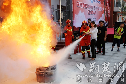 圖為宣傳員手把手傳授滅火器撲滅火災現(xiàn)場。 官易洲攝