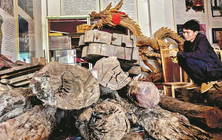 圖為:修復(fù)木雕龍頭