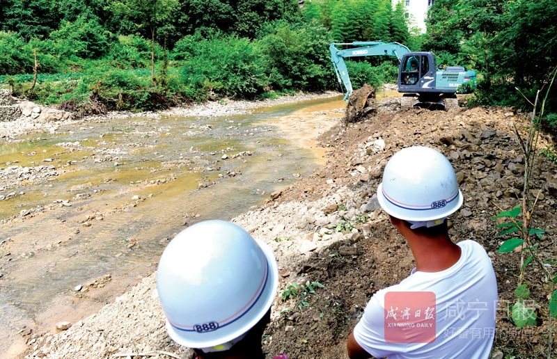 12日,崇陽(yáng)縣白霓鎮(zhèn)河田港紙棚村段,大型挖掘機(jī)正在疏浚河堤護(hù)坡。