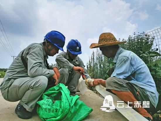 田紅云朋友圈中的這位微信好友是赤壁市供電公司的黨委書記余柒明。在得知斗門村農(nóng)田出現(xiàn)干旱的基本情況后,余柒明立即組織車埠供電所“星火”黨員志愿服務(wù)隊的志愿者們趕到現(xiàn)場勘查旱情,在向農(nóng)戶了解抽水灌溉的實(shí)際困難后,他們頂著高溫,將低壓線路引至遠(yuǎn)處的水源地,裝設(shè)電能表、漏電保護(hù)器、連接抽水泵,經(jīng)過一個多小時的作業(yè),讓水嘩啦啦流入了農(nóng)戶干涸的農(nóng)田。