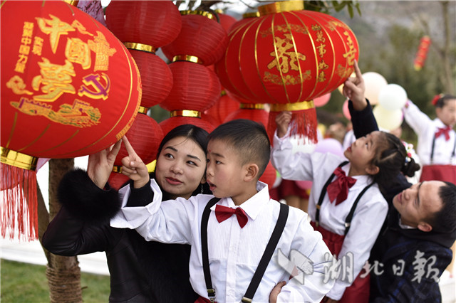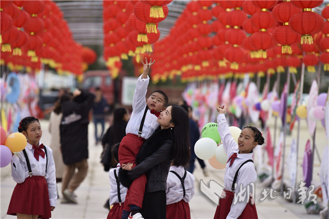 2019年2月2日,小朋友在通城縣塘湖鎮(zhèn)荻田村紅色廣場紅燈籠旁合影。當日,湖北省通城縣塘湖鎮(zhèn)荻田村在紅色廣場舉行花傘彩燈民俗節(jié)活動,以趕集逛廟會,舞龍、旗袍秀、跳廣場舞、觀花傘彩燈、草扎、鄉(xiāng)土美味等多彩民間活動展示美麗鄉(xiāng)村建設成果,在濃濃的年味中喜迎新春。(視界網(wǎng)劉建平攝)