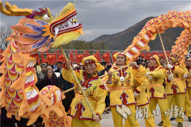 2019年2月2日,民間藝人在通城縣塘湖鎮(zhèn)荻田村紅色廣場舞龍。