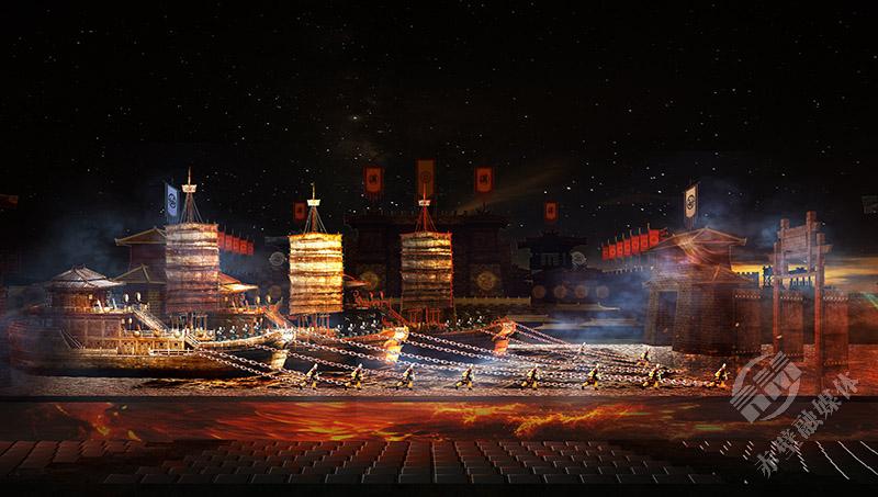 2000多年前,諸葛亮借的東風,是摧枯拉朽、克敵制勝的戰(zhàn)火雄風;2000多年后,三國赤壁古戰(zhàn)場借的東風,則是凝心聚氣、砥礪奮進的時代之風。演出將赤壁之戰(zhàn)這盤歷史大棋置于天地之間,以三國群雄為弈者,以演員和觀眾為棋子,利用光影特效與舞美裝置的變換,將戰(zhàn)役的多個關(guān)鍵情節(jié)進行藝術(shù)化提煉與重構(gòu),運用聲、光、電等現(xiàn)代舞美技術(shù),將歷史與現(xiàn)實、虛擬與真實融為一體,構(gòu)建起一個戰(zhàn)火紛飛、羽箭穿空的三國世界,讓赤壁之戰(zhàn)從史書中的符號躍升為可觸摸、可參與的精神場域。