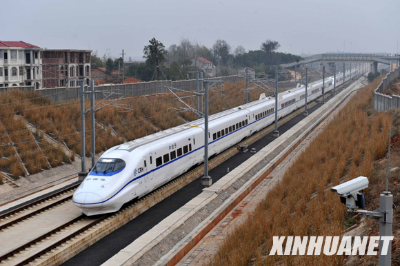 12月26日9時(shí)16分,從武漢始發(fā)的首列動(dòng)車組列車快速通過湖北咸寧北站。 當(dāng)日,武廣高鐵正式通車運(yùn)營(yíng),標(biāo)志著我國(guó)步入高速鐵路新時(shí)代。 新華社記者 皮曙初 攝