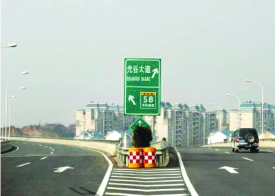三環(huán)線由天興洲大橋往東新開發(fā)區(qū)光谷大道的一塊指路牌,左行指的是“關(guān)豹高速”,右行指的是“光谷大道”;但該路口左行是經(jīng)武黃高速去鄂州方向的,右行是經(jīng)三環(huán)線去白沙洲大橋方向的。路牌因信息不全、牌面又小,不少駕車人員到該路口時(shí)停車查看,不知行進(jìn)方向。