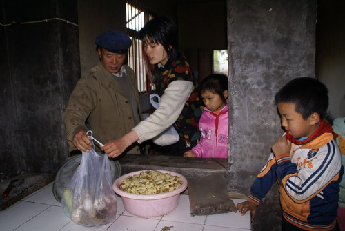 圖為:早晨,丁潔將學生帶的土豆、玉米面、蒜頭等送到“愛心食堂”(由社會愛心人士捐建的),交給食堂師傅給孩子們做中餐